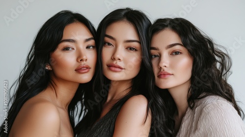 Three beautiful women with long dark hair and natural makeup stand close together and look at the camera.