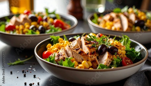 salad, chicken, corn, olive, tomatoes, healthy, delicious, fresh, grilled, bowl, dinner, lunch, vegetable, protein, mediterranean, cookery, colourful, tasty, appetising, food, plate, dish, serving, eatery, meal, ingredient, nourishment, freshness, balanced, diet, deliciously