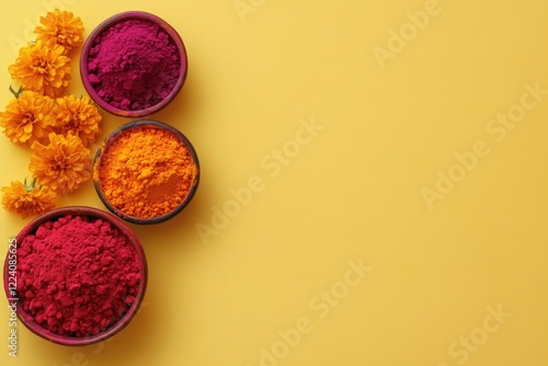 Three bowls of different colored powders are arranged on a yellow background. The bowls are filled with red, orange, and yellow powders. The arrangement of the bowls