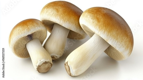 Three brown mushrooms isolated on white background. Fresh, healthy, edible fungi with thick stems and caps.