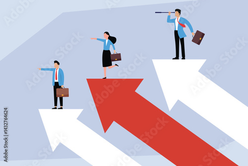 vector, illustration, cartoon, business, growth, leadership, vision, success, career, development, strategy, direction, progress, achievement, ambition, opportunity, forward, looking, telescope, arrow, people, man, woman, professional, corporate, office, teamwork, goal, target, future, plan, management, finance, economy, market, competition, challenge