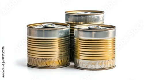 canned food, can, preserved food, white background, isolated, grocery, supply, cooking, ingredient, sustenance, nourishment, diet, healthy eating, food photography, still life, minimalist, studio shot, closeup, texture, detail, rustic, aged, vintage, old, weathered, damaged, imperfect
