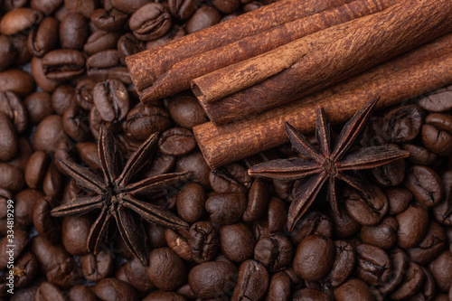 Three cinnamon sticks and a star anise against the background of coffee beans