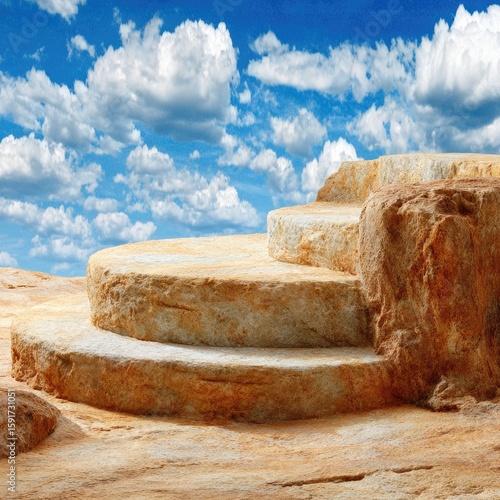 Three circular stone steps ascend against a vibrant blue sky dotted with fluffy white clouds, suggesting a journey or achievement
