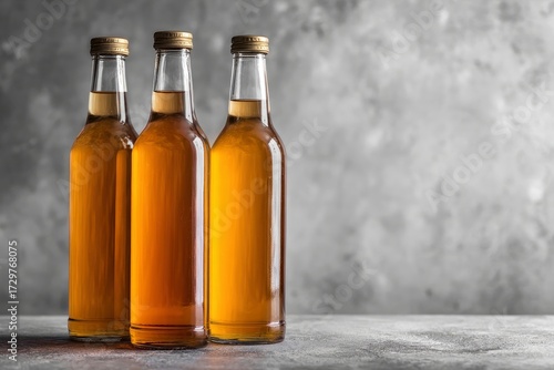 Three clear glass bottles with golden liquid and metal caps stand in a row against a gray mottled background