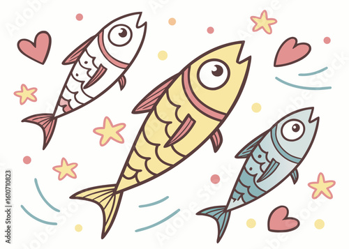 Three colorful cartoon fish swimming with stars and hearts