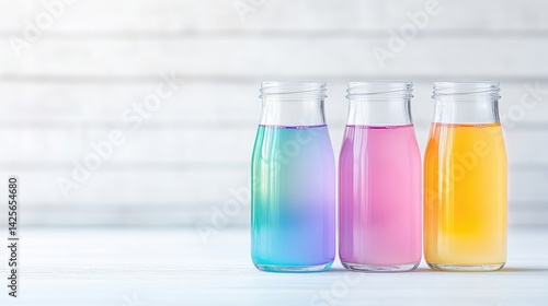 Three colorful glass bottles filled with vibrant liquids, arranged in a row on a light wooden surface with a soft focus white brick wall background, and minimalist and modern composition.