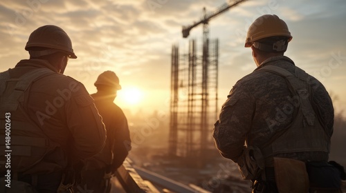 Three construction workers watch as the sun rises, casting golden light across the building site with cranes towering in the background. The atmosphere is calm and promising