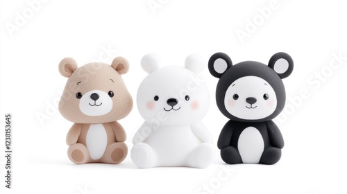 Three cute clay teddy bears sitting, white background, nursery decor
