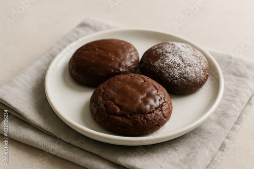 Three delicious chocolate cookies on a white ceramic plate, fresh baked dessert for snack or coffee break on light linen napkin