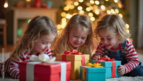 Three delighted children admiring colorful Christmas gifts on a cozy rug