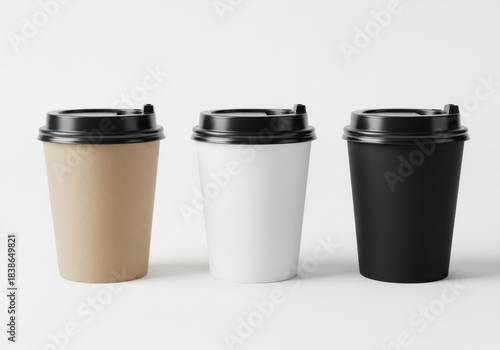 Three disposable coffee cups with black lids on a clean studio surface showcasing variety