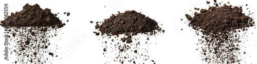 Three distinct piles of rich brown soil for gardening, landscaping, or agricultural use, showcasing texture and quality. on transparent background
