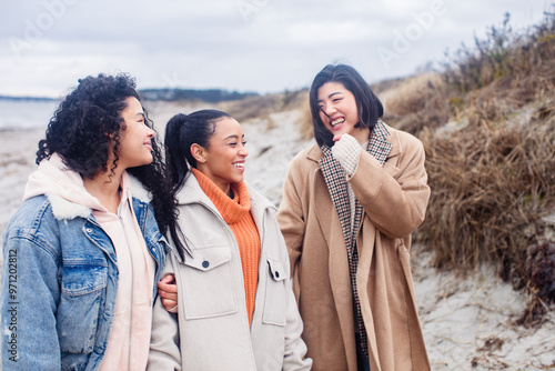 people, three, diverse, young, female, friends, walking, beach, winter, woman, asian, african american, friendship, togetherness, outdoors, cold, coastal, leisure, activity, bonding, nature, scenic, chilly, casual attire, relaxation, diversity, inclusion, equity, fresh air, healthy lifestyle, connection, group, sea, sand, recreation, coastline, holiday, seasonal, youth, social, emotion, freedom, lifestyle, copy space