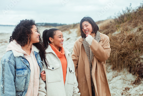 Three diverse young female friends walking on the beach in winter