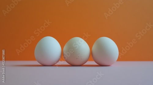 Three eggs in pastel colors on soft orange surface with minimalist food styling and abstract balance concept scene