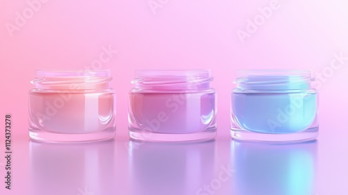 Three elegant jars of cream in pink, lavender, and blue arranged symmetrically on a soft pastel gradient background with a dreamy, glowing aesthetic