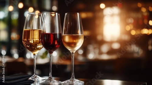 Three exquisite wine glasses filled with different types of wine are highlighted against a warm, glow of sunset, creating a perfect ambiance for sophisticated gatherings.