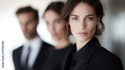 three, focused, businessperson, 2, woman, 1, man, posing, formally, contemporary, office, corridor, professional, corporate, image