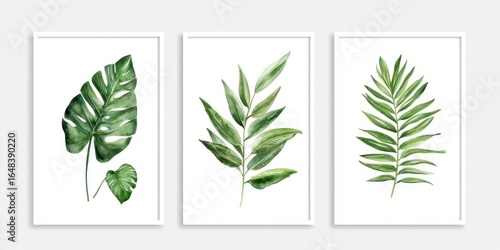 Three framed botanical prints featuring tropical leaves on a white background. The prints are minimalist and showcase detailed green foliage.