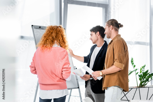 business, girl, sunlight, caucasian, sunshine, sunny, brown, friendship, european, man, pink, office, woman, talk, talking, together, togetherness, friends, indoor, inside, casual attire, sweater, photogenic, daylight, businesswoman, businessman, businessperson, paperwork, document, paper, daytime, good-looking, flipchart, shirt, startup, young adult, backview, three people, startup