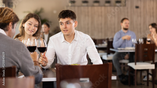 Three friends meeting in modern restaurant - men and a woman drinking wine, talking, discussing problems