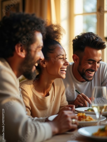 friends, dinner, laughter, food, cosy, home, evening, atmosphere, dining, table, sunlight, joy, companionship, togetherness, warmth, meal, eating, casual attire, gathering, happiness, smile, conversation, relaxation, tasty, vibrant, socialising, celebration, bonding, enjoying, drink, appetiser, vegetarian, cheerful, intimate, sharing, culture, kitchen, memory, together, friendship, love, connection, smiling, generative, ai