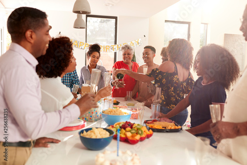 Three generation black family raising glasses to make a toast during a celebration at home, close up