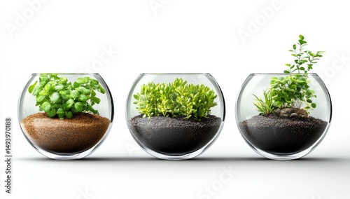 Three glass terrariums showcase diverse plants and soil types