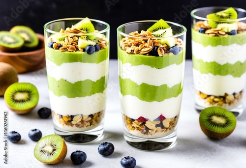 Three glasses filled with fruit and granola on top of a table.