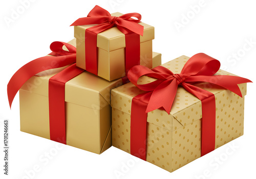 Three golden gift boxes with red ribbons, perfect for any celebration, holiday, or special occasion