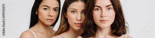 panorama, panoramic, people, young, brunette, portrait, woman, female, adult, together, background, white, beauty, isolated, girl, look, studio, pose, model, friends, jean, diversity, indoor