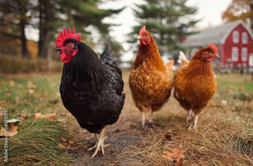 hen, rooster, farm, barn, autumn, chicken, red, black, brown, feather, rural, country, scene, fall, leaf, tree, landscape, nature, agriculture, farm animal, poultry, bird, animal, outdoors, setting, idylli, peaceful, tranquil, image, photograph, photo, background, foreground, colours, texture, detail, light, morning, afternoon, composition, beauty, seasonal