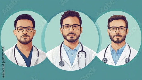 Three illustrations depict male doctors in circular frames against teal backgrounds. Each doctor sports a lab coat and stethoscope, showcasing a professional medical image.
