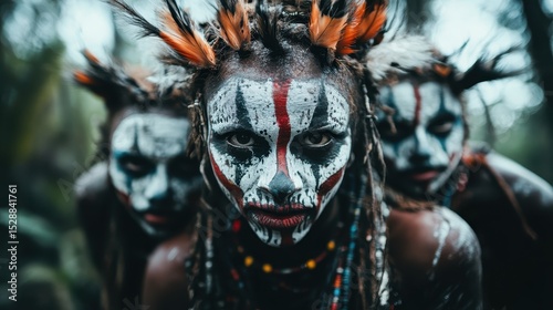 Three individuals adorned with striking tribal face paint stare intensely, capturing the essence of cultural heritage and human expression through bold artistic artistry.