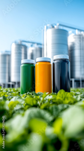 Three juice bottles in green, orange, and black stand on fresh leafy greens, with large industrial silos blurred in the background under a clear blue sky.