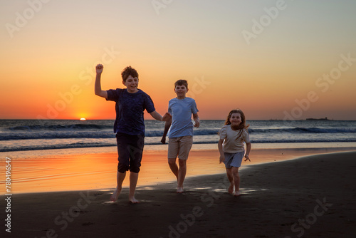 Three kids silhouettes running and jumping on beach at sunset. happy family, two school boys and one little preschool girl. Siblings having fun together. Bonding and family vacation.