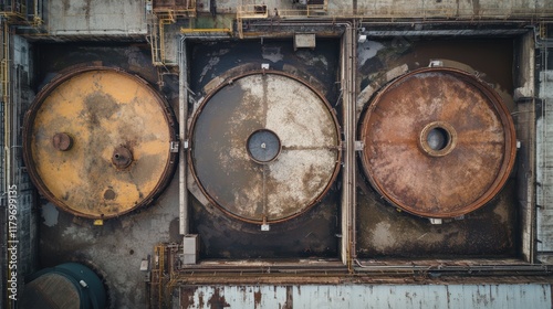 Three large, rusty, and dirty tanks are shown in the image