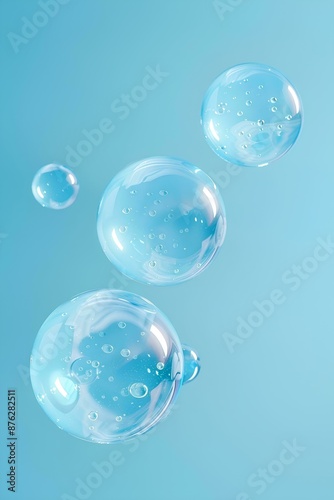 Three light blue transparent bubbles with water molecules inside floating on a solid background. The bubbles have an abstract geometric pattern and filled with clear liquid that reflects