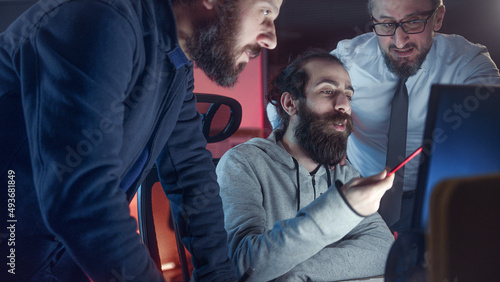 Three male colleague workers collaborating in office talking while looking at computer screen together at workplace