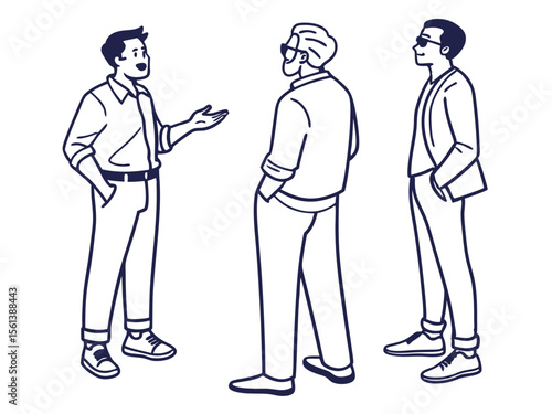 three, man, talking, casual attire, chat, scene, vector, white, background, art, design, illustration, line, vignetting, draw, conversation, group, discussion, friends, people, style, pattern, logotype, simple, minimal, modern, graphic, unique, classic, clean, meeting, team, social, network, communication, community, dialogue, relax