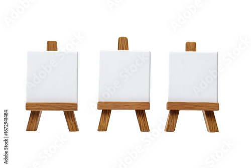 Three mini easels art canvas painting display stand holder wood tabletop small artist sketching drawing craft isolated on transparent background