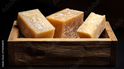 Three natural handmade soap bars in various shades of yellow and orange sit in a rustic wooden box. The setting features a dark background to highlight their unique textures.