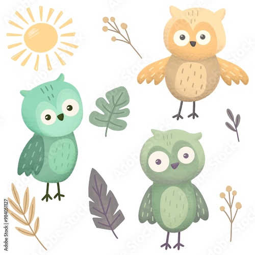 children, element, cute, fun, drawing, icon, tree, love, funny, pattern, owl, bird, animal, cartoon, set, design, nature, baby, art, card, animal, character, illustration