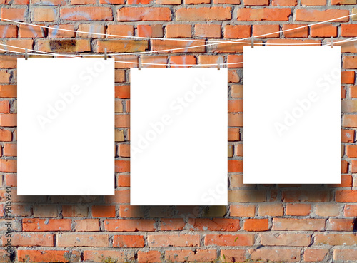 Three paper sheet frames hung by clothes pin on orange brick wall background