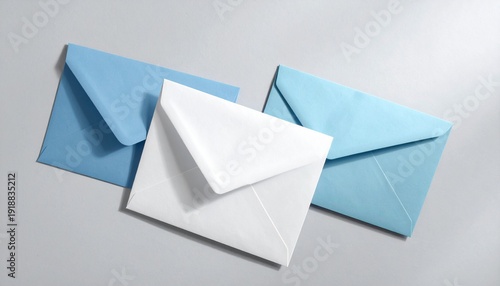 envelope, mail, letter, paper, blue, white, stationery, communication, message, post, send, receive, invitation, card, greeting, office, business, personal, correspondence, document, writing, blank, empty, closed, folded, square, rectangular, object, item, background, grey, simple, clean, neat, organised, stack, group, collection, set, trio, 2, 1, light, soft, pastel, colours, shade, tone, texture