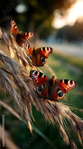 Three Peacock Butterflies Resting on Wheat Stalks Natural Habitat Close-Up Serene Environment Nature Photography