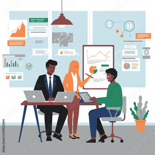 office, meeting, discussion, teamwork, collaboration, business, people, man, woman, laptop, computer, chart, graph, datum, whiteboard, presentation, planning, strategy, corporate, work, employee, professional, desk, furniture, interior, indoor, office supply, plant, potted plants, illustration, graphic, vector, communication, brainstorming, analysis, research, project, success, learning, cognition, information