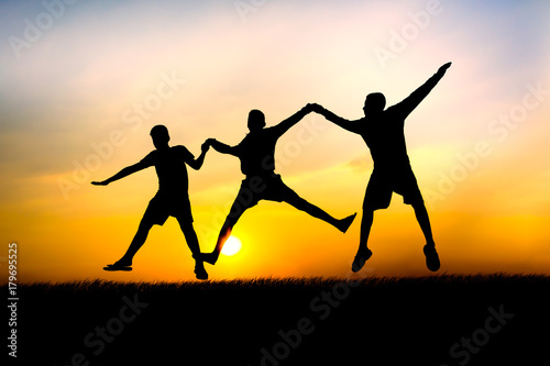 three people silhouetted against an orange sunset, jumping and holding hands.