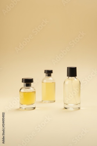 Three perfume bottles with a yellow liquid on a beige background. Minimalist and elegant composition.